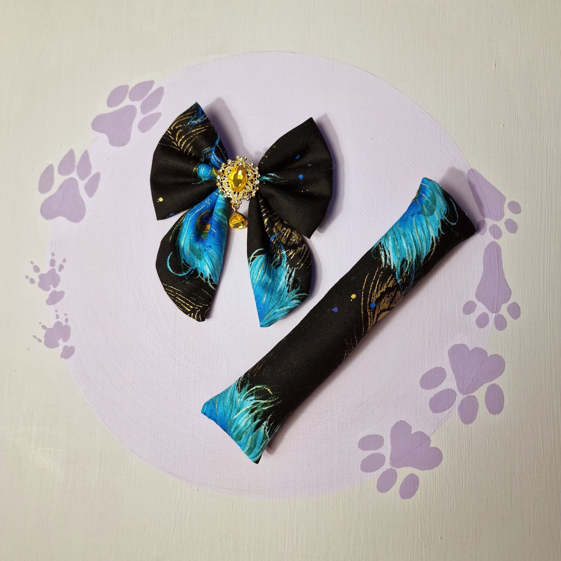 This stunning set includes 1 standard size sailor bow and one matching catnip kicker toy.